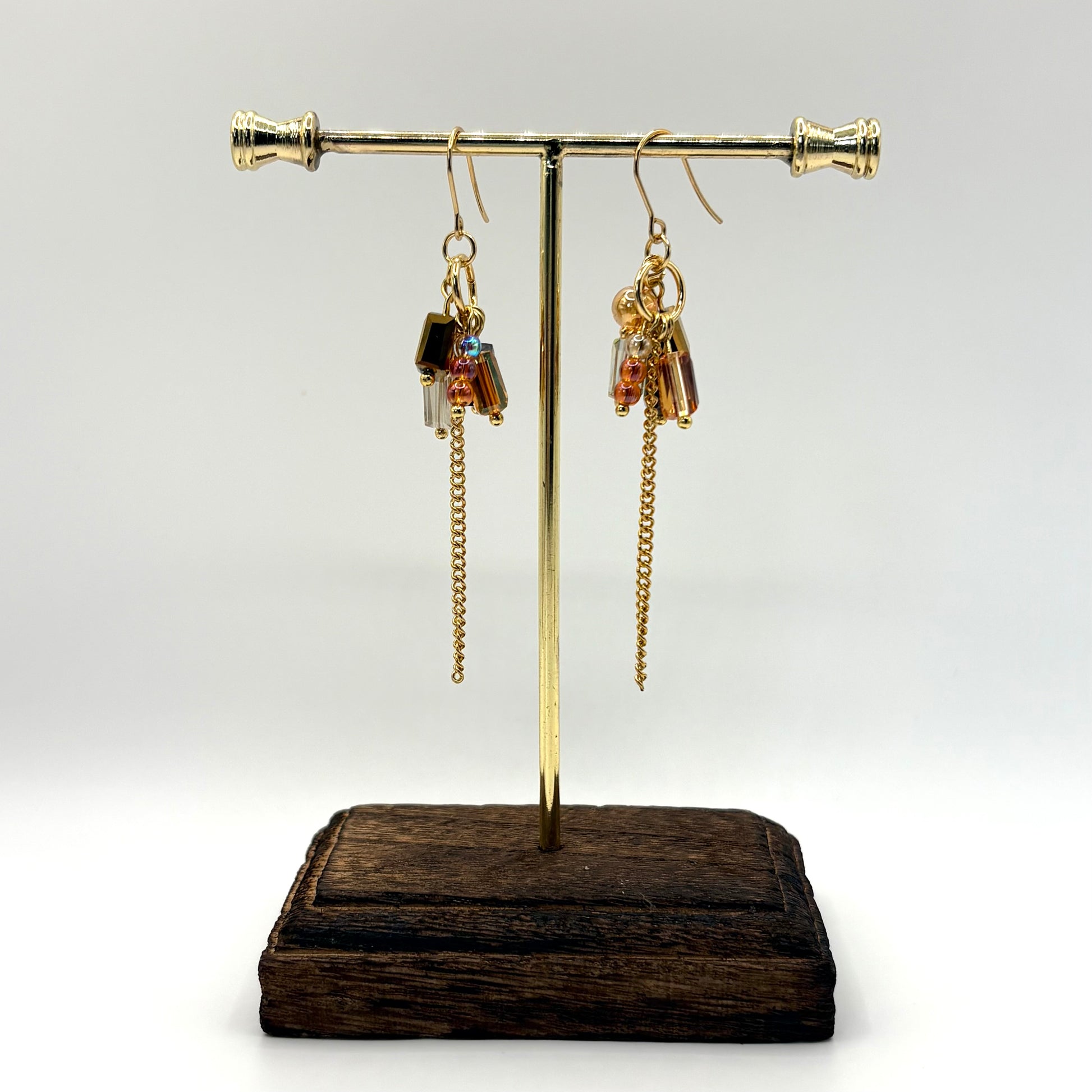 Amber Relics is een asymmetrisch paar statement oorbellen opgebouwd uit warme goud- en ambertonen, gecombineerd met donkere accenten en fijne schakels. Meerdere kleine elementen hangen los van elkaar en zorgen voor beweging en een gelaagde uitstraling.