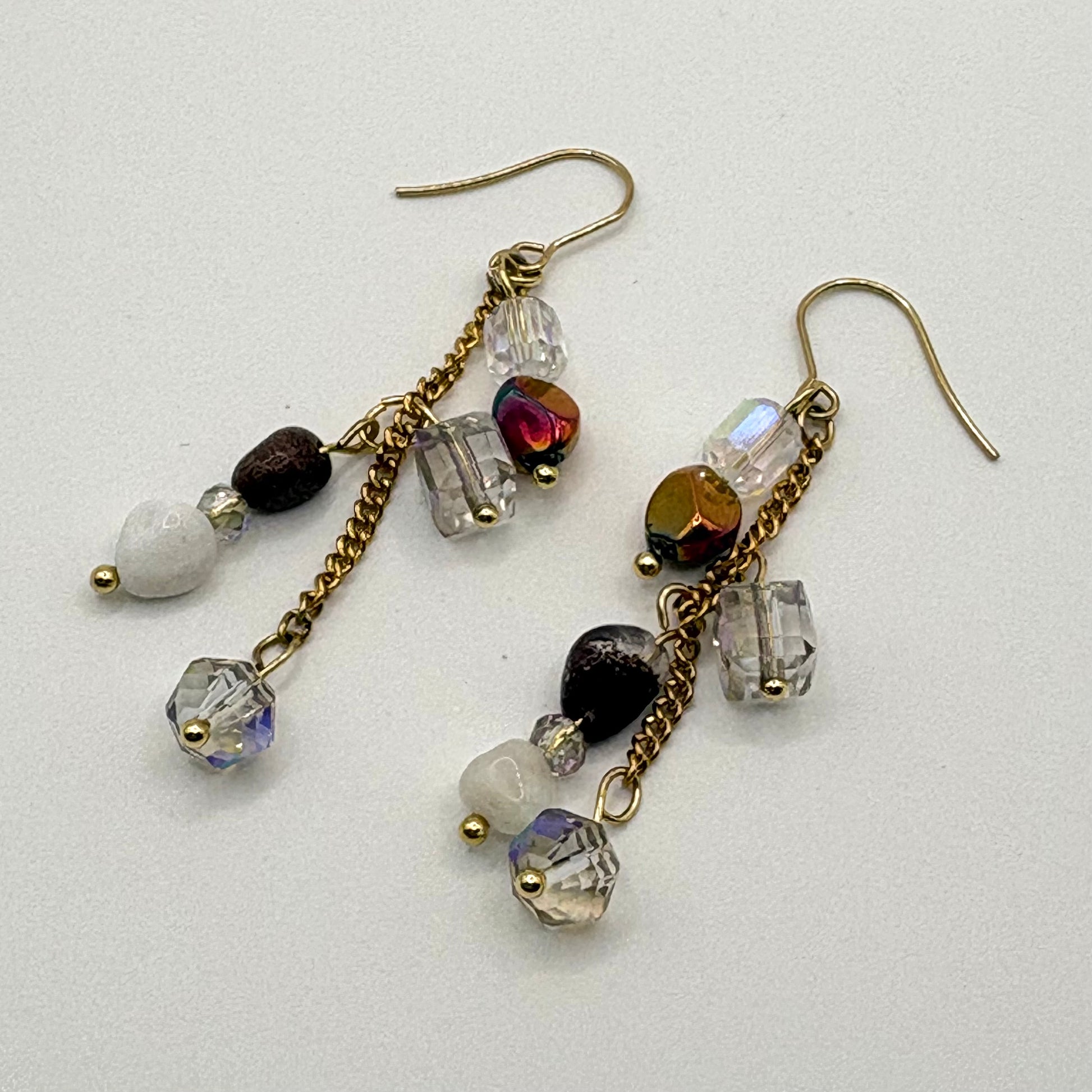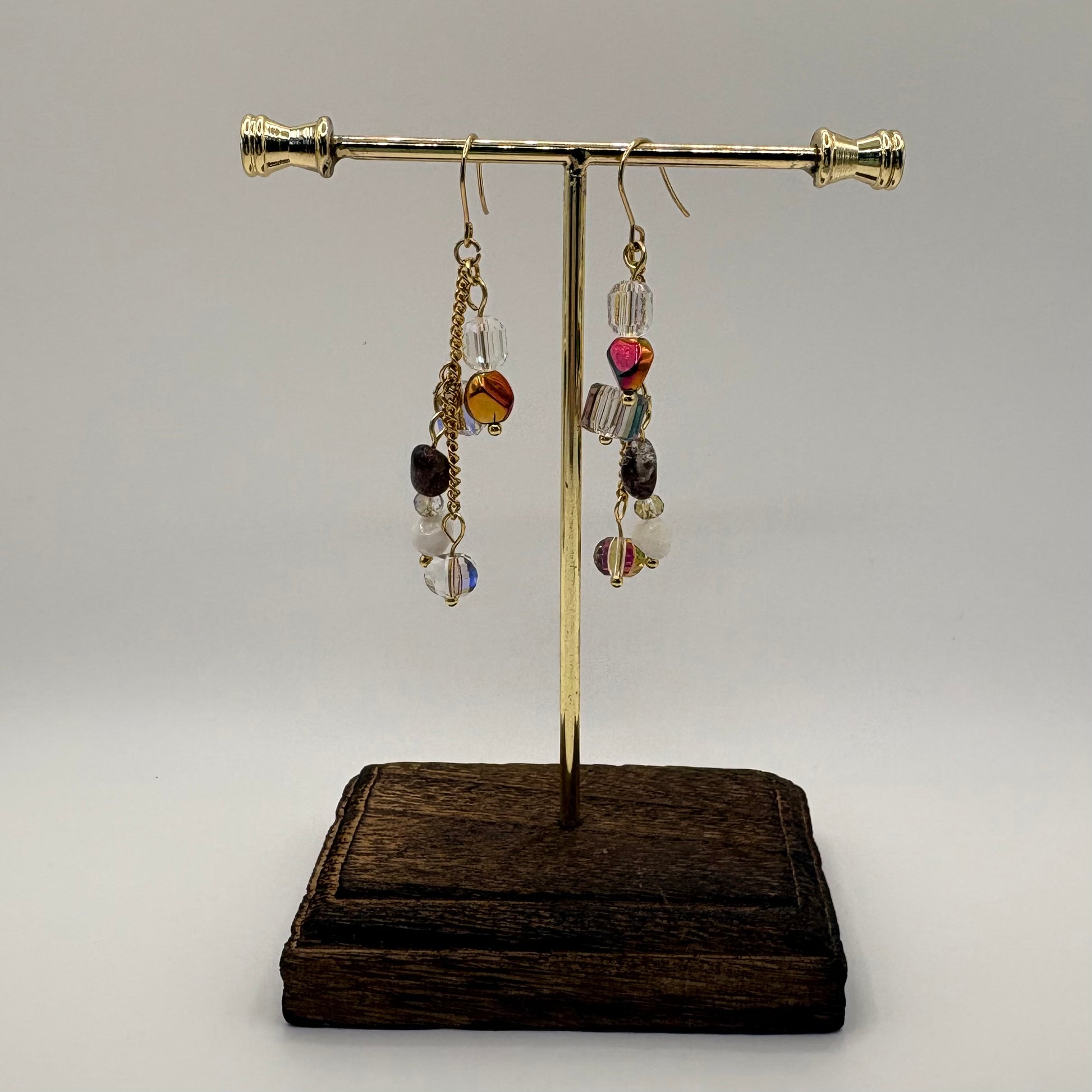 Calico is een speels maar verfijnd paar oorbellen waarin verschillende materialen en tinten samenkomen tot een harmonieus geheel. Transparante facetgeslepen kralen worden gecombineerd met warme, donkere accenten en subtiele kleurreflecties, waardoor het ontwerp levendig blijft zonder onrustig te worden.
