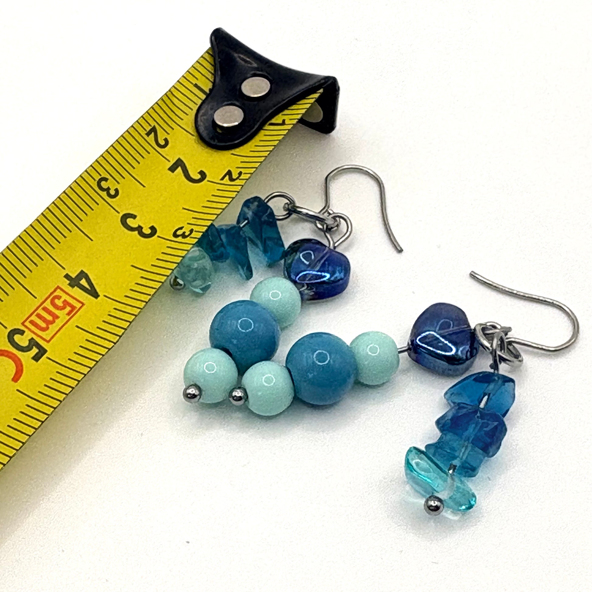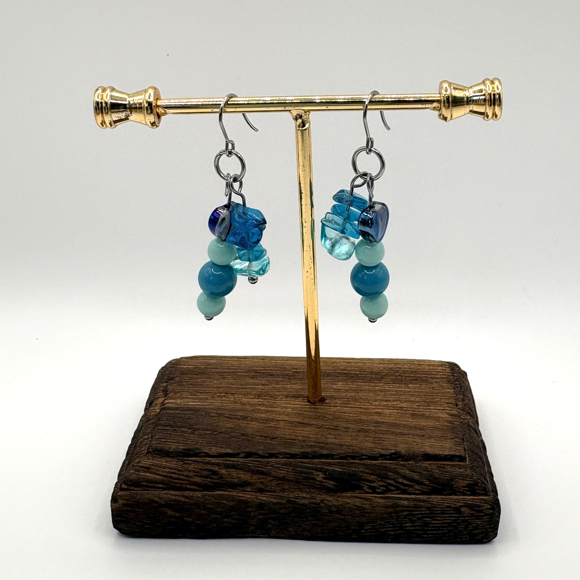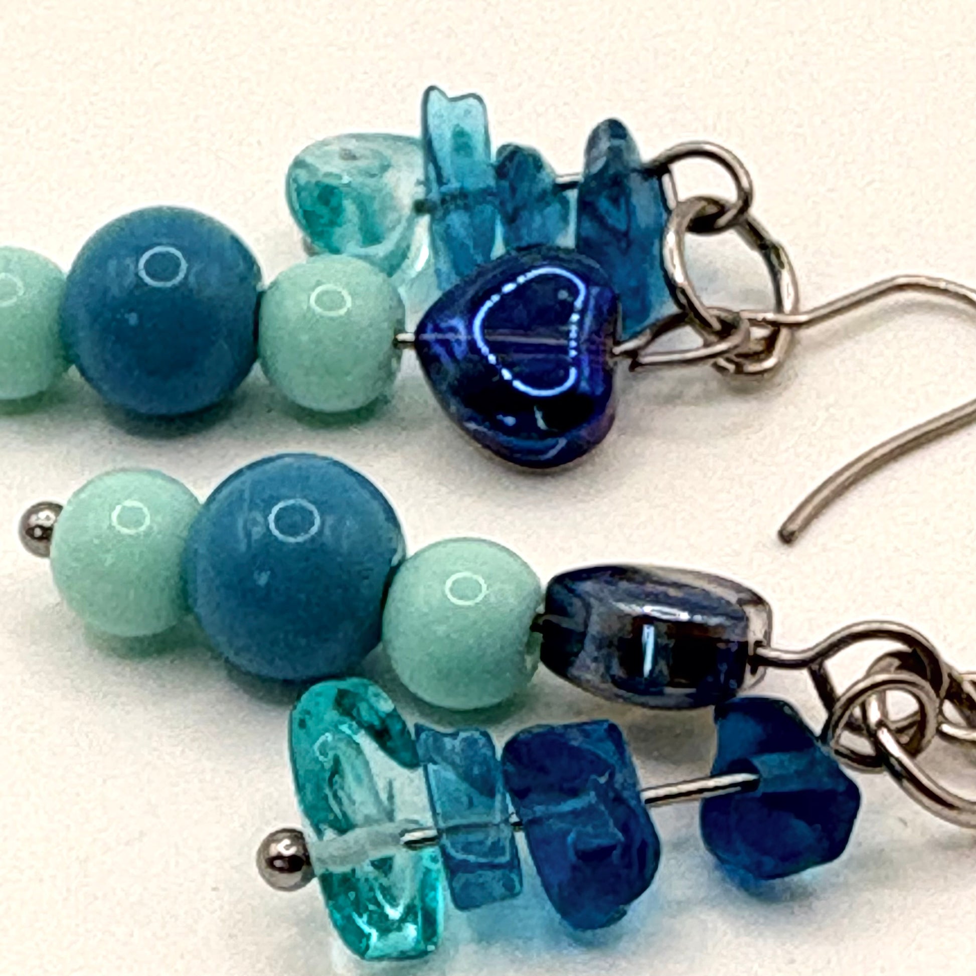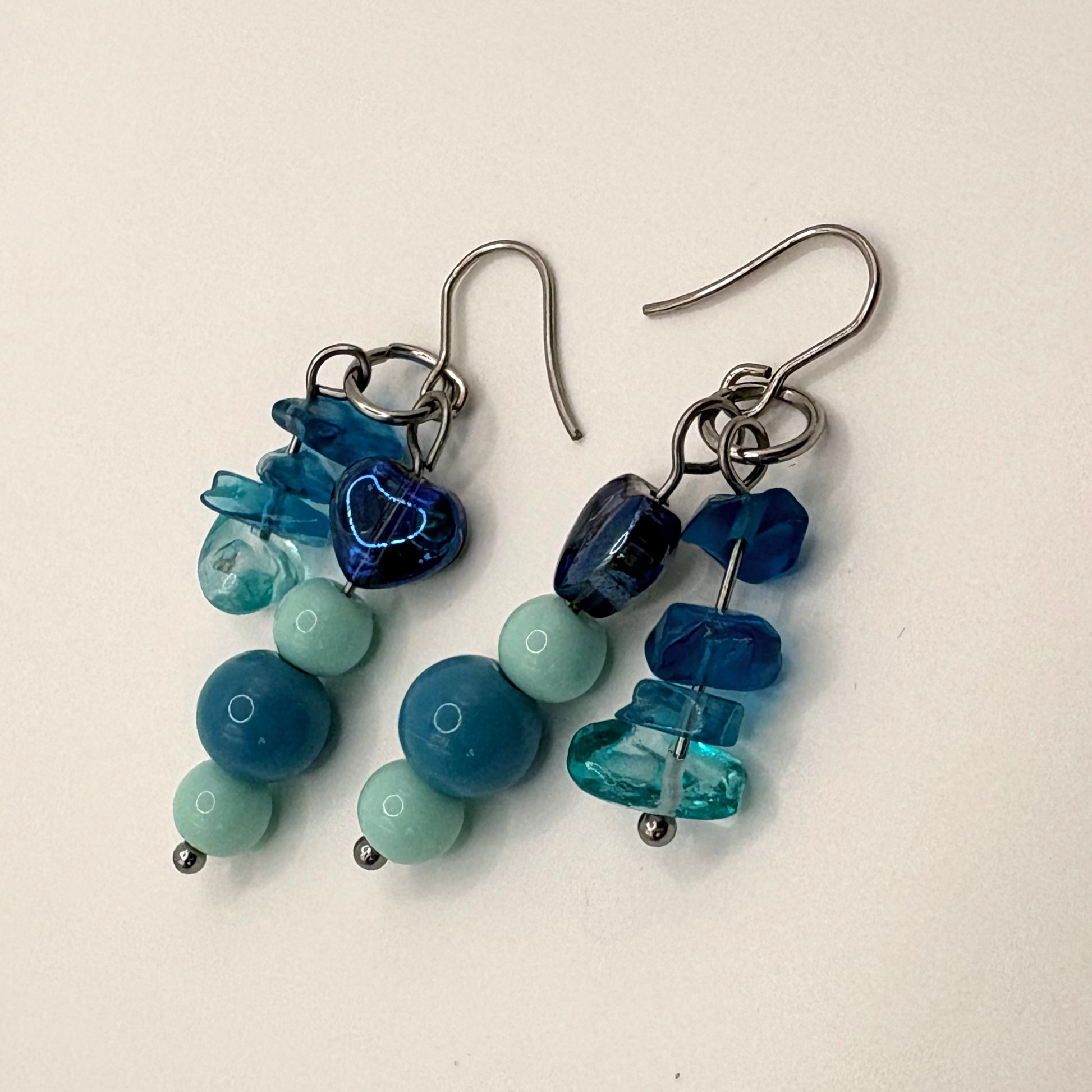 Meanwhile is een speels paar oorbellen waarin verschillende blauwtinten en zachte groentinten samenkomen. De mix van gladde kralen en onregelmatige, transparante vormen zorgt voor een levendig geheel met een natuurlijke flow.