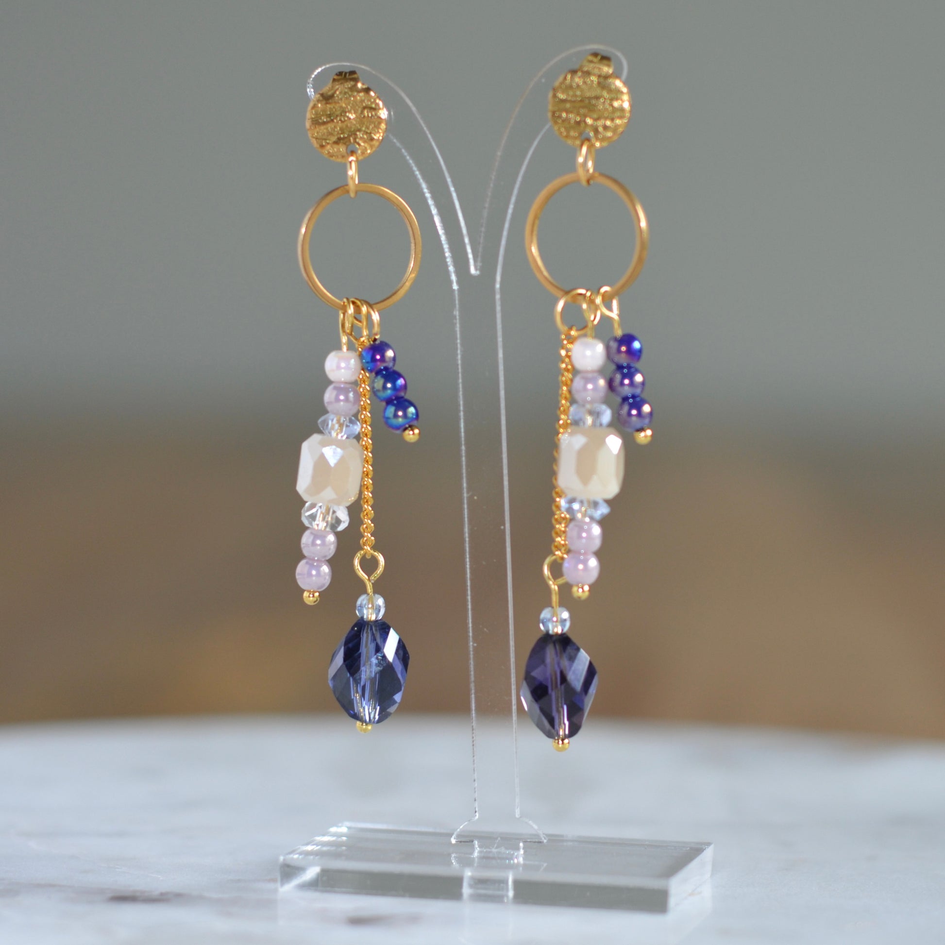 Deze goudkleurige oorbellen combineren diepe paarse en lila tinten met zachte beige en lichtroze accenten. De mix van facetgeslepen paars, parelachtige kralen en fijne goudkleurige ketting zorgt voor een speels maar verfijnd effect.