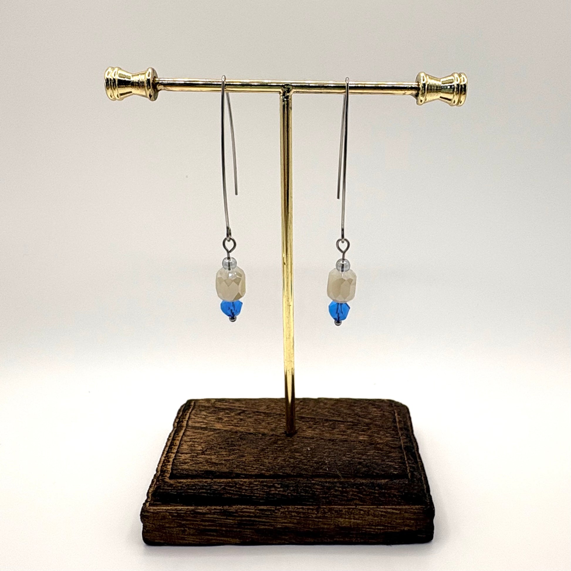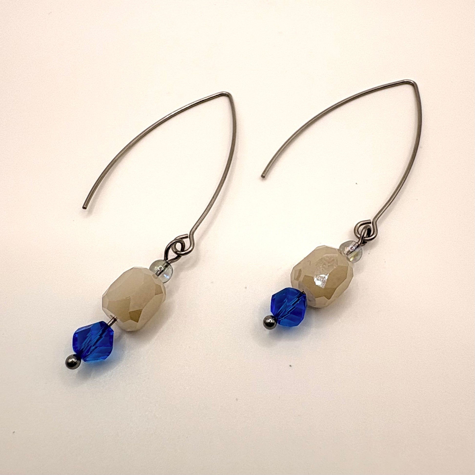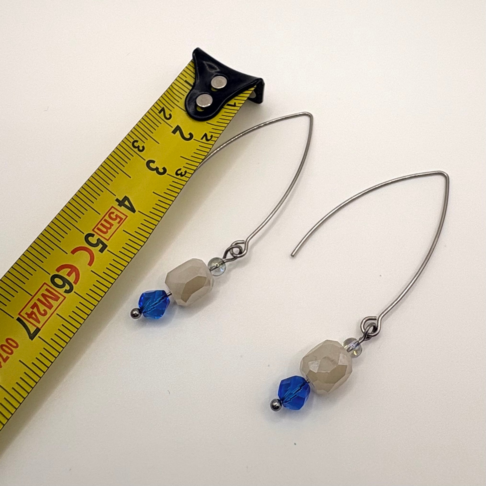 Quiet Contrast is een verfijnd paar oorbellen waarin zachte, porseleinkleurige tinten worden gecombineerd met een helder blauw accent. De facetgeslepen kralen zorgen voor subtiele lichtreflectie en geven het ontwerp een rustige maar sprekende uitstraling.