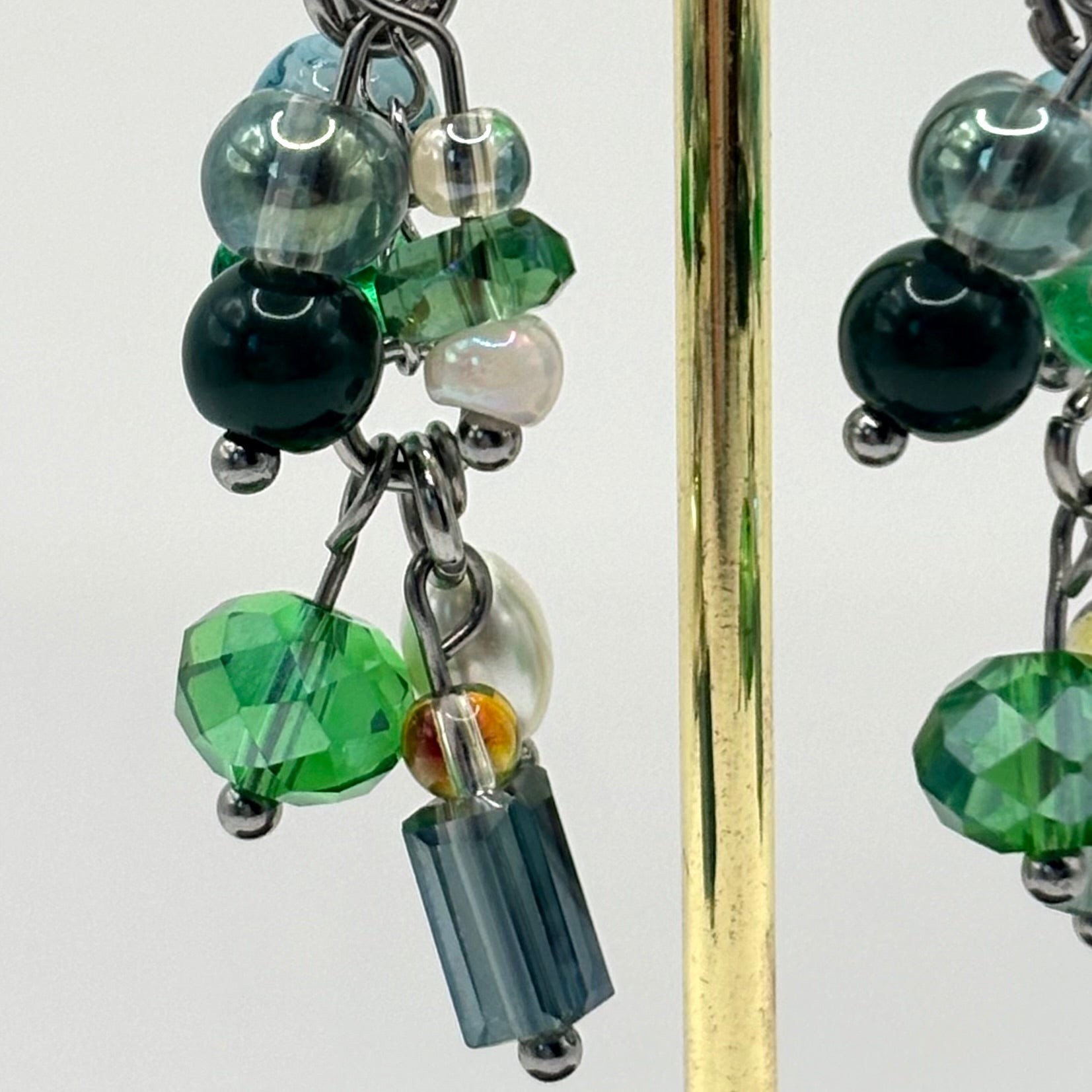 Verdant Night is een asymmetrisch paar statement oorbellen waarin diepe groentinten worden gecombineerd met koele blauwen, zachte parelglans en donkere accenten. De verschillende kralen zijn los aan elkaar geschakeld, wat zorgt voor een gelaagde en levendige uitstraling.